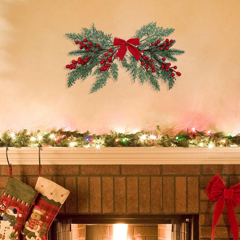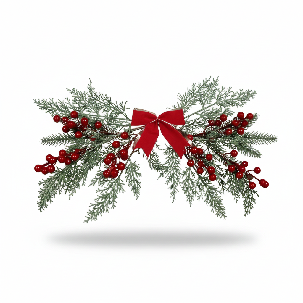 Tipo: Pingente decorativo com folhas de cipreste, bagas vermelhas e detalhes sazonais