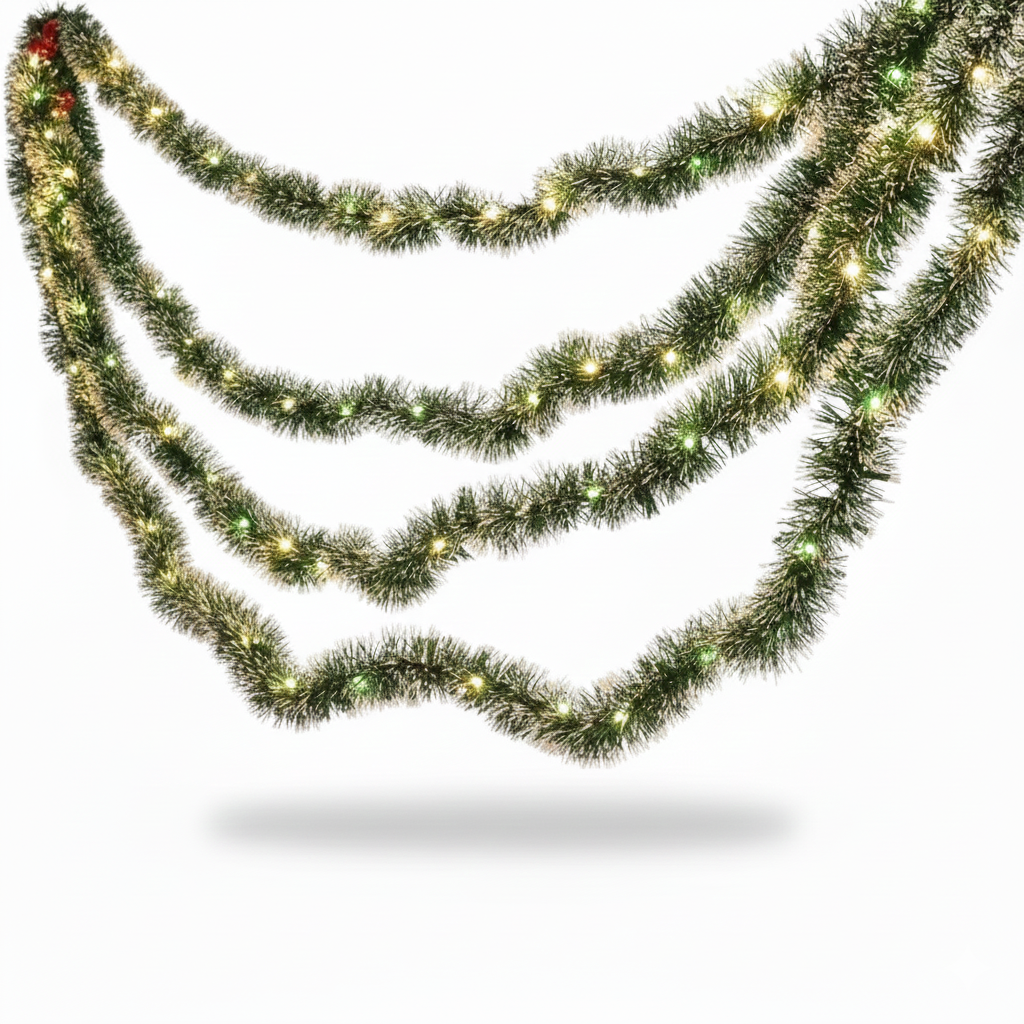 Transforme sua decoração natalina com esta guirlanda cintilante de 2 metros, perfeita para levar mais cor, brilho e alegria ao ambiente. Com acabamento metálico, ela reflete a luz de maneira encantadora e se adapta facilmente a árvores, escadas, mesas, paredes e muito mais.