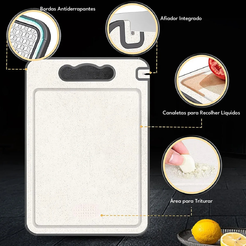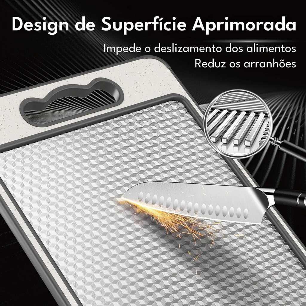 A tábua dupla face entrega higiene avançada, corte seguro e resistência extrema, elevando o preparo dos alimentos ao nível de uma cozinha profissional — sem esforço e sem complicações.