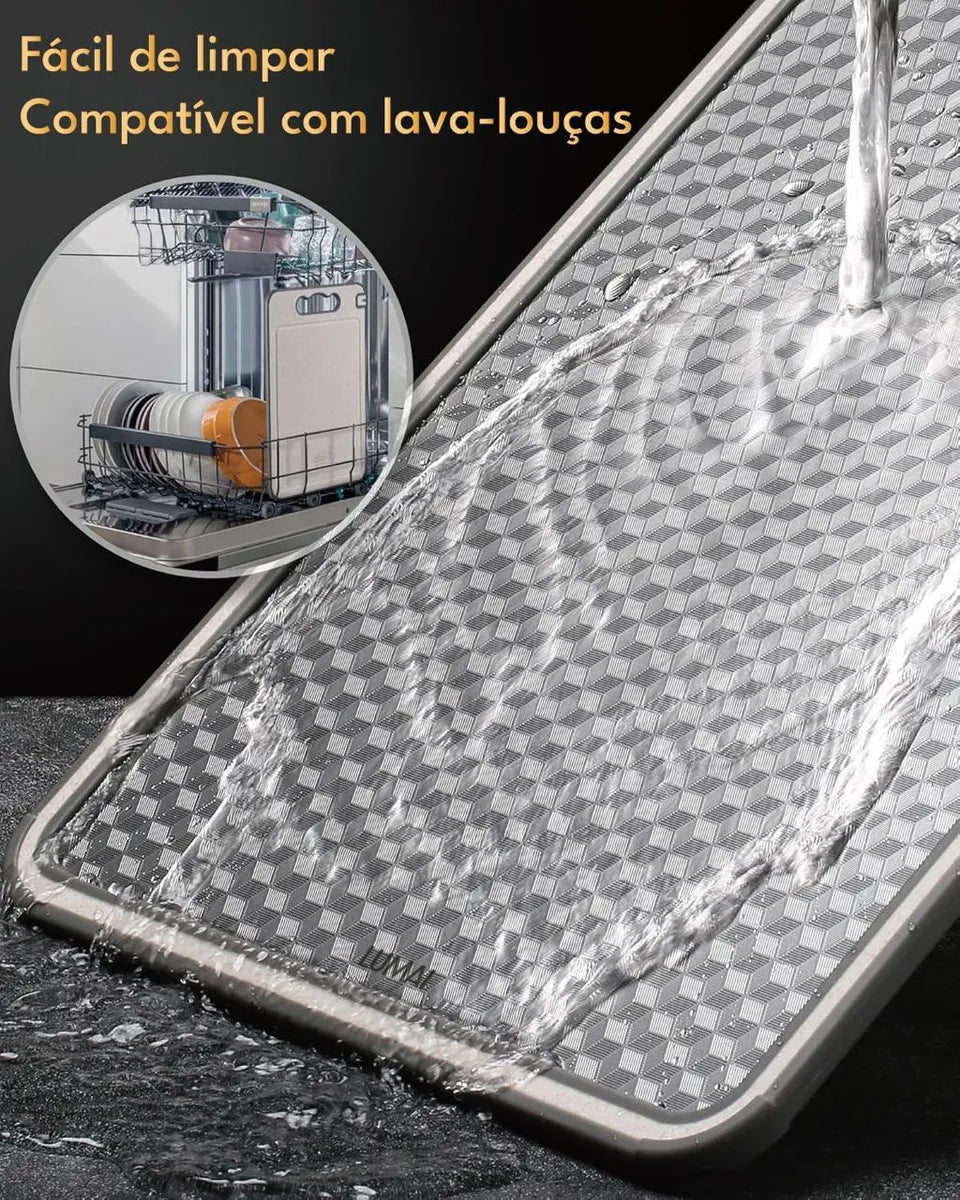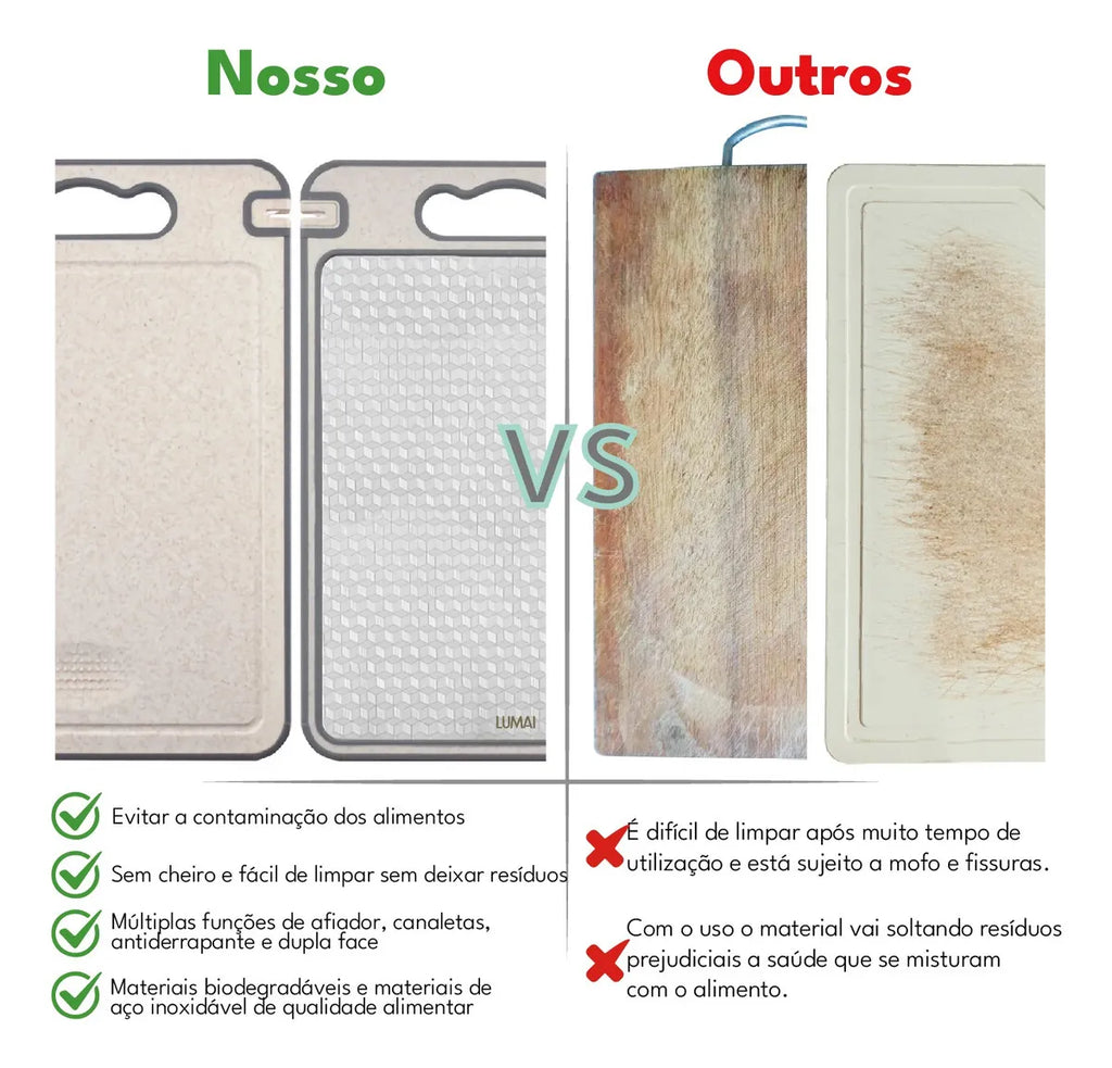 A maioria das tábuas de corte tradicionais — seja madeira, plástico reciclado ou bambu — acumula fungos, bactérias, líquidos e odores, além de desgastar rapidamente as facas.